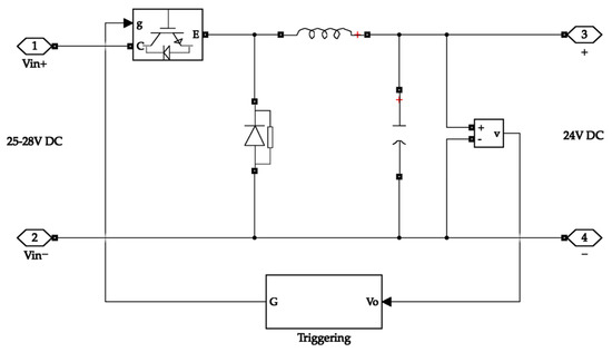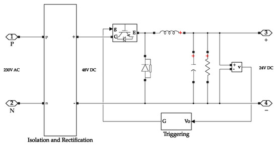 The buck converter on the input side takes its input from the isolation and rectification circuit. The isolation secures the system from surges while the rectification circuit converts the AC input waveform into a DC waveform. The buck converter then steps down the voltage to 24 V, which is the operating voltage of the electrolyser. Figure 6 depicts the buck converter on the input side.