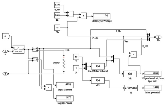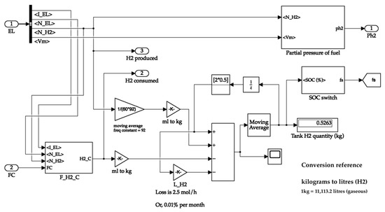 The electrolyser block calculates the ideal potential of one cell, the molar volume of hydrogen, and the amount of hydrogen produced by the electrolyser. The electrolyser output carries the value of the amount of hydrogen produced, the number of cells in the stack, electrolyser current, and molar volume. The Simulink diagram for the electrolyser system is depicted in Figure 7. The hydrogen tank requires the molar volume value for calculating the tank pressure. At the same time, the remaining values are necessary for calculating the hydrogen consumed and tank quantity values.