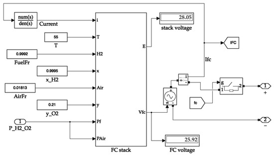 The fuel cell system receives the partial pressure value from the tank system and passes it to the block containing its stack. The other necessary parameters of the fuel cell that are assumed to be static are fed into the stack block in the form of constants. The fuel cell block calculates the output voltage value of the fuel cell and generates an electrical equivalent signal. The signal terminals are considered to be the output of the fuel cell. Figure 10 shows the inside of the fuel cell block. Figure 11 illustrates the simulation circuit of the output side buck converter.