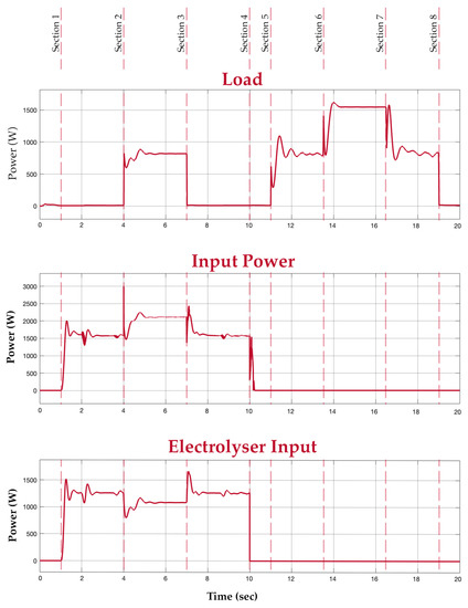 Before discussing the obtained results, it is vital to clarify the application of the proposed system. The proposed system is an alternative for applications where a battery is used. The hybrid system intends to replace the battery in large-scale scenarios where a fuel cell, electrolyser, and battery can be accommodated, for example, in an electric vehicle. To illustrate the working of the developed hybrid system, a test situation is considered with different sections. All the sections collectively illustrate the hybrid system’s output in different scenarios. For understanding, section (n) will be considered the period between section (n) and section (n + 1) in the graphs shown in Figure 14 and Figure 15. In Section 1, the hybrid system is given a power supply from the grid. In this section, it is depicted that the switching algorithm turns on the electrolyser and also allows the battery to charge. In Section 2, a load of 800 W is connected while the input supply is still available. In this section, since the power supply is still available, the electrolyser is still switched on to produce hydrogen. Additionally, the system supplies power to the load directly by conditioning the voltage from the grid. This is depicted in the input and load graphs, where the input power increases with load. The fuel cell and battery output graphs show that no power is withdrawn from them in this section. In Section 3, the load is disconnected while the supply is on, switching the system back to the way it functioned in Section 1. The input power supply is then disconnected in Section 4.