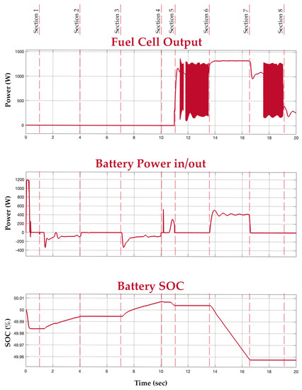 In Section 5, a load of 800 W is introduced again, now in the absence of an input power supply. In this period, the fuel cell is turned on to supply power to the load. This is depicted in the load and fuel cell graphs. At this medium load, the mean power value of the fuel cell is considered. The buck converter, however, smoothens the output. In Section 6, an extra load of 800 W is connected to the system. Since the new total load exceeds the fuel cell’s power rating of 1.26 kW, the battery supports the fuel cell to meet the new load demand. This is depicted in the battery graph. Section 7 has the extra load disconnected, switching the system back to the way it functioned during Section 5. Finally, in Section 8, all loads are disconnected and there is also no input power. It is evident from the graphs that the battery supports the system during transients and additional load.