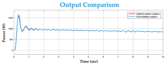 To observe the load performance, the hybrid system’s output is compared to the output of a typical battery-only system against an identical load. A typical battery of 24 V and 2 kW power rating is taken for comparison. The battery-only system’s rated power is the same as the proposed system’s combined rated power. The systems are both connected across the identical load individually and are simulated for the same time period. Figure 16 shows the output comparison between both systems.