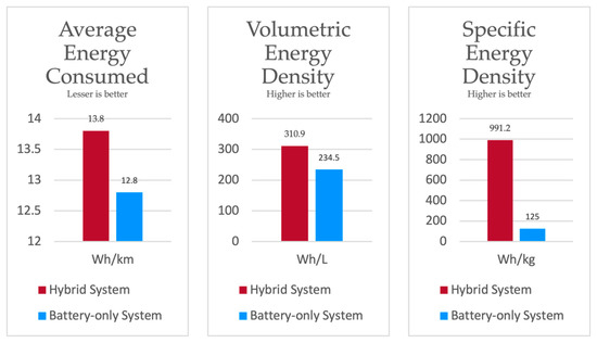 The potential of the proposed system over a battery-only system is its energy density. The energy consumption and densities obtained from test vehicle simulation with the WLTC homologation drive cycle are illustrated in Figure 17. With the adopted components, the theoretical cost of the hybrid system is approximately estimated to be USD 8000, whereas the estimated cost of the battery-only system is approximately USD 300. The steep difference in cost is due to the high price of fuel cell systems. Slashing further costs in the proposed system lies in the courtesy of future innovations. However, in the current scenario, the proposed system would be cheaper for large volume applications, since extending the capacity of the hybrid system would only require extra tanks.