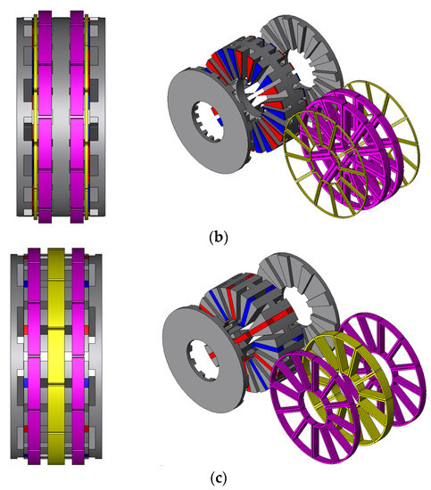 Topologies and 3D exploded views of three AF-DR motors: (a) DSPM, (b) FRPM, (c) FSPM.