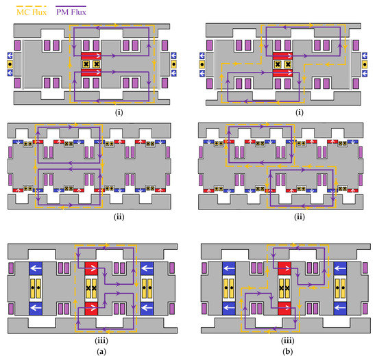 The magnetic flux distributions with different rotor positions are depicted in Figure 2 to illustrate the operation principles of the motors. All three motors operate under a similar principle: when no cornering action is required, no current is injected into the MC windings. Thus, there is only PM flux in the motor, as shown in the distribution of purple lines in Figure 2; when the vehicle is moving curvilinearly, MC flux will be generated in the motor due to the injected DC current in the MC windings. It can be seen in Figure 2 that, on the upper rotors of the DSPM and FSPM motors and the lower rotor of the FRPM motor, the MC flux strengthens the overall flux flowing through the paths, while on the opposite rotors, the flux is weakened. Consequently, the torque produced from two sides will no longer be equal, leading to the different speeds of two rotors, then the vehicle starts cornering. As a result of cornering, two rotors will no longer be aligned. Nevertheless, the differential torque to rotors can still be created as the overall flux remains regulatable by the MC flux, as depicted in Figure 2b. Therefore, the cornering of the vehicle can be continuously and successfully achieved.