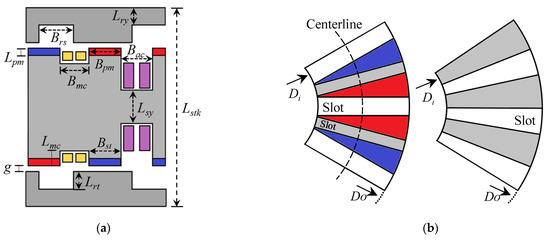 Figure 3 depicts the key design parameters of the proposed AF-DR FRPM motor, which for the DSPM and FSPM motors are omitted due to similarity. The slot adopts a rectangular shape to ease the complexity of motor fabrication, as mentioned in [17]. Hence, the rotor slot arc Brs, MC winding arc Bmc, and armature winding arc Bac are calculated based on the centerline, as shown in Figure 3b. In the case of the DSPM motor, its MC winding arc and PM arc are both equal to the armature winding arc Bac. The optimization of the DSPM and FRPM motor follows the same practice used for the FSPM motor in [17], aiming at providing a reasonably large torque and suppressing the torque ripple. Additionally, the analysis is conducted by 3D simulation using the FEA software JMAG. To make the comparison fair enough, all motors take on the same constraints in [17], that is, 420 mm outer diameter Do for the motor, 0.6 mm air-gap length g, and 186.4 mm stack length Lstk. The slot filling factor is selected as 0.6.