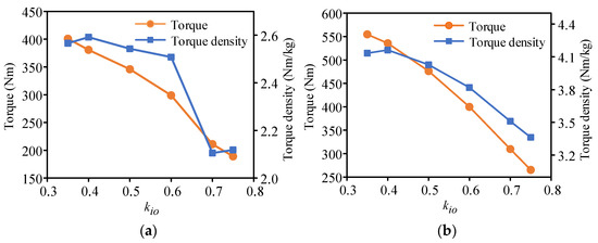 where Tem is the electromagnetic torque, Bave is the average flux density in the air gap, Ain is the electrical loading, kd is the distribution factor, and kio is the ratio of inner and outer diameter or the split ratio that equals Di/Do. From Equation (5), one can see that, apart from the constraints, the split ratio kio is the key factor for determining the motor torque. Thus, the split ratio should be optimized priorly. Next, the PM thickness Lpm, rotor slot arc Brs, armature winding arc Bac, thickness of the rotor yoke and teeth Lry and Lrt, and stator yoke thickness Lsy are optimized orderly, and the results are shown in Figure 4. Note that arcs are in degree and lengths are in mm.