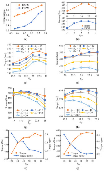 Optimization results. (a) kio—DSPM, (b) kio—FRPM, (c) torque ripple vs. kio, (d) torque vs. Lpm, (e) Brs and Bac—DSPM, (f) Brs and Bac—FRPM, (g) Lry and Lrt—DSPM, (h) Lry and Lrt—FRPM, (i) Lsy—DSPM, (j) Lsy—FRPM.