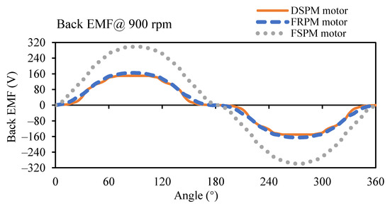Figure 5 illustrates the A-phase no-load back EMFs of three motors. It can be seen that the FSPM motor shows a more sinusoidal waveform and a significantly larger amplitude than its two counterparts due to its exquisite structure. On the contrary, the DSPM and FRPM motors show trapezoidal waveforms. Therefore, the FSPM motor adopts the brushless (BL) AC control strategy, whereas BLDC controls for the other two motors.