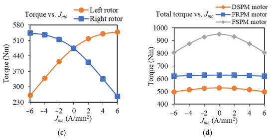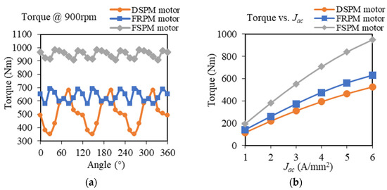 Simulated with the same 6 A/mm2 current density Jac, the torque performances of the motors are shown in Figure 6a. Similar to the traditional comparison of these three motors, the FSPM motor shows the best torque performance, that is, the highest torque and lowest torque ripple, while the DSPM motor is inferior to the other two counterparts. Additionally, the average torque versus Jac is evaluated as depicted in Figure 6b, where all motors saturate more or less when the current density increases.