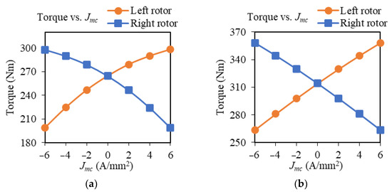 Torque performances of three AF-DR motors without MC current: (a) Jac = 6 A/mm2; (b) different armature current densities.