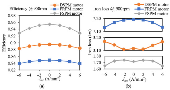 Figure 8a illustrates that with the injection of the MC current, extra copper loss is introduced; thus, all motors experience efficiency drops. Besides, due to the reduction of output torque with the increase in MC current, the efficiency of the DSPM motor and FSPM motor is further decreased. As regards the iron loss, the FRPM motor shows the largest iron loss due to its 12 s/16 p structure, which means that with the same rotor speed, the FRPM motor applies the highest armature current frequency. Hence, its iron loss is remarkably larger in comparison.
