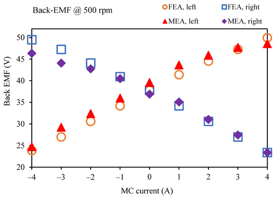 From Figure 10, one can see that due to the symmetrical structure of the two rotors, the FEA results of back-EMFs on both rotors share similar patterns, having a peak value of around 35 V. For the measured amplitude of the back-EMF on the right rotor, it turns out to be nearly 34 V, which is a little lower than an amplitude of approximately 37 V on the left rotor. This is resulted from the fabrication tolerance, for example, unequal air-gap length. Thus, it can be inferred that the stator is installed slightly towards the left rotor. However, even with the inevitable fabrication tolerance, the measured results fit the FEA results well. Then, the MC current is injected into the MC windings to validate their ability to regulate the air-gap flux density reversely on two rotors. The results are illustrated in Figure 11. It can be seen that while increasing the MC current from −4 to 4 A, the back-EMF amplitude on the right rotor decreases from 50 V to less than half of it, around 24 V in the FEA condition. Meanwhile, for the measured back-EMF, it drops from nearly 45 V to a similar endpoint. Nevertheless, on the other hand, the back-EMF amplitude on the left rotor is lifted along the same MC current change for both FEA and MEA conditions. Besides, the phenomenon resulting from the unequal air-gap length can also be seen in Figure 11. The balanced point of the experimental result shifts slightly from the theoretical point when the MC current is equal to zero. However, overall, the MEA results meet well with the FEA results, and the amplitudes of back-EMF on two rotors are proven to be successfully reversely regulated by the MC current in the experiment.
