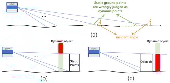 For good localization performance and reliable path planning, a ‘clean’ map containing only static objects in the environment is expected, which is necessary for the navigation system. Researchers have proposed many methods based on ray-tracing or visibility [20,21,22] for dynamic object removal and static map construction, which may have disadvantages [23], as shown in Figure 2, while achieving certain effects. As shown in Figure 2a, the static ground plane is regarded as a dynamic object when the incident angle is too large. For the case in Figure 2b, if there is no point cloud behind the high part of the dynamic object due to the open terrain, the high part cannot be removed. Meanwhile, occlusion has always been a troubling problem, if a dynamic object is partially occluded by a static object, the occluded part cannot be removed, as shown in Figure 2c.