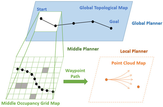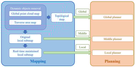 As shown in Figure 3, the mapping representation module contains six sub-modules for navigation, namely global point cloud map, traverse area detection and representation, dynamic objects detection and removal, topological skeleton extraction, middle map construction and local map maintenance. Correspondingly, the planning module is also divided into different levels, which are responsible for planning from the global level to the local; in descending order, the hierarchy is as follows: the global planner, middle planner and local planner. To meet the requirements of the three-level planner, we use the global traversable topology map for the top-level global planner. For the more refined requirements of the middle level local planner, we use appropriate scales to divide the map into local areas and combine the observation information to form a submap. Furthermore, for the requirements of motion and obstacle avoidance control of the bottom-layer local planner, we combine real-time observation to update the local submap in real time to ensure the safety and reliability of navigation.