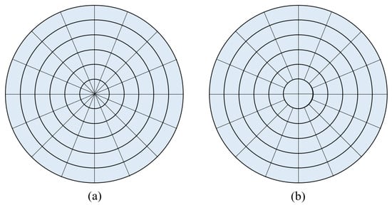 where , and represents the points in , and represent the maximum of , respectively. However, this method results in bins that are too small near the center of the area of interest and too few points in these bins, which may lead to subsequent misjudgments. So, we chose to increase the angle range of the inner circle sectors, as shown in Figure 4b.