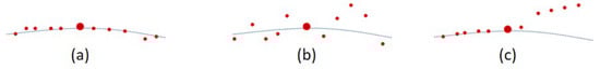 (a) Possible situation of real ground points. (b) Possible situation of grass points. (c) Possible situation of road edge points (where the big red circle is the tested scanning point, and the small red circles are its neighborhood points).
