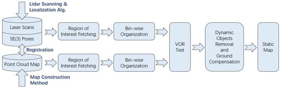 It is assumed that the point cloud map is obtained by some methods and it may contain dynamic objects. Besides the map, the inputs also include laser scan data of the same or different terms, and it is assumed that the pose information corresponding to the scans can be accurately registered to the map. We define the original point cloud map as M, the laser scan data at a certain time t as , and the pose under the map coordinate system corresponding to is .