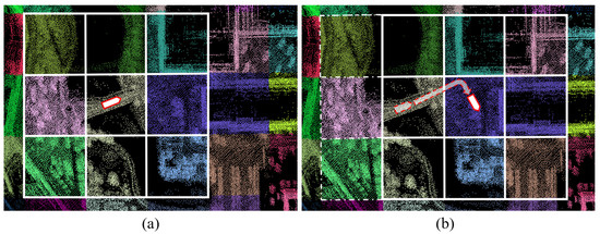 Point cloud map segmentation: (a) Submap before moving. (b) Submap after moving.