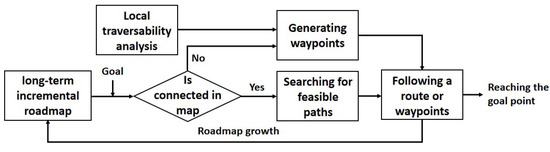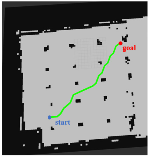 As one of the classic graph-search algorithms, A* has good performance and accuracy. It uses heuristic information to find the optimal path, which is suitable for the path-planning algorithm as the topmost layer in the waypoint graph. Since the global planner uses the waypoint map jointly processed by the PRM and the distance map, it can find a near-optimal global path faster. A flow chart demonstrating the process from the setting up of the global target point to the completion of the path is provided in Figure 9.