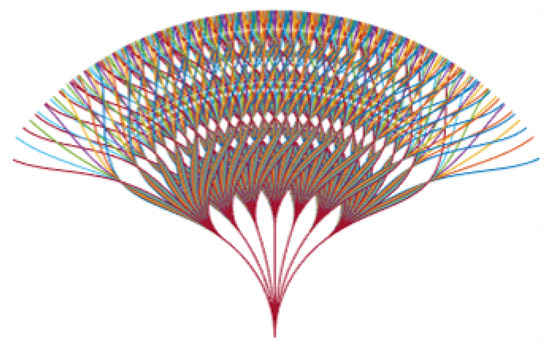 - Free Path: The free path uses the sampled discrete points for forward simulation, which represents the possible movement of the vehicle in the future. As shown in Figure 11, through multiple data uniform interpolation and data fitting, 729 possible paths are planned as candidates;