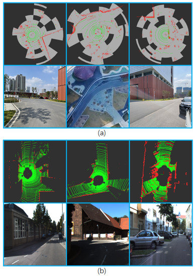 Results of traverse area detection experiment: The upper part of (a,b) is the segmented point cloud (the green part is the divided ground point cloud, the red part is the non-ground point cloud, and the gray part represents the bins described in Section 3.2.2), and the lower part is the corresponding picture.
