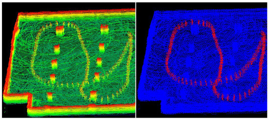 In the original point cloud map, there will inevitably be dynamic objects. Furthermore, the trajectory of dynamic objects will accumulate in the map along with the construction process. As shown in Figure 13, in addition to the environmental structures of ground and walls, there are dynamic objects—walking people (red points in right part of Figure 13), as well as static objects—pillar buildings. We use the method in Section 3.2.3 to remove dynamic objects without affecting the static part of the environment.
