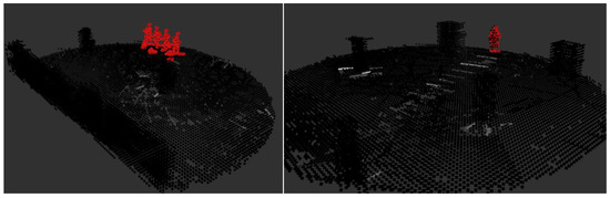 During dynamic object detection, the extracted region of interest (black point cloud in the figure) and the resolved dynamic object (red point cloud in the figure) are shown in Figure 14.