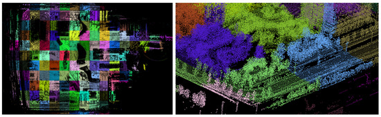 We divide the global static point cloud map into fixed size local submaps according to the method in Section 3.2.4. The result is shown in Figure 16, and we represent each submap with a different colored point cloud for clarity.