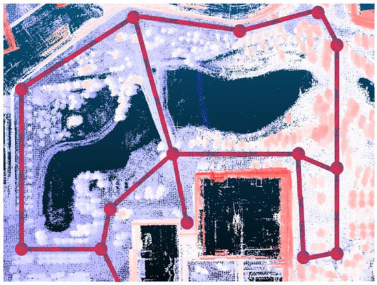 In the park environment, the ground is not generally flat as a whole, so it is inappropriate to use uniform ground coefficients to describe the traversable area. Therefore, our system uses the method of regional ground plane fitting to detect the traversable area. Based on bin-wise organization, select the point with the lowest height (i.e., z value) in each bin. If its height is lower than the possible ground-level threshold (determined by the height of the LiDAR and actual environmental conditions), it may be a potential ground point, and take it as a seed point. Then, the flatness test of seed points is taken. The local ground surface can generally be regarded as a horizontal or slightly inclined plane, the changes of height and distance of the ground scan points in the small neighborhood should be nearly uniform, while the scanning point cloud of the road edge and the grass will change sharply or irregularly. Based on the above characteristic, on the same scan line of the seed point, take N points left and right of the seed point and then denote its neighborhood. Additionally, calculate the sum of the distances from the points in the neighborhood to the seed point. If the sum value is less than the set distance threshold and the height of the point is less than the set height threshold (the threshold takes a specific value after sorting all the points on the scan line where the seed point is located), then keep it; otherwise, discard it. Therefore, this step can exclude the edge of the road and grass point cloud, as shown in Figure 5.