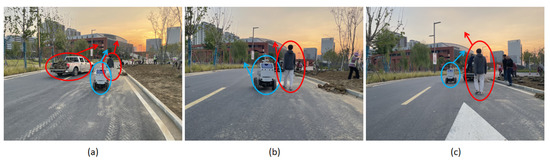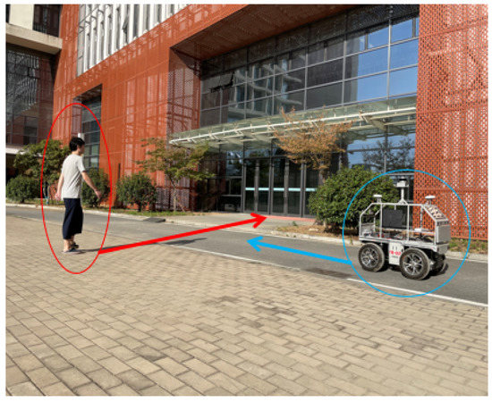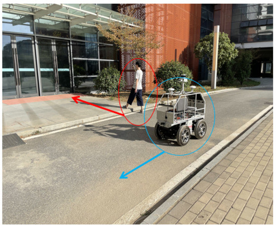 In order to test the dynamic obstacle avoidance ability of the navigation algorithm, we arrange pedestrians to actively block the driving path of vehicles. As shown in Figure 19, the vehicle is driving in a straight line in the current lane, with the driving direction of the vehicle as the front, and a pedestrian in the left front is walking perpendicular to the driving direction of the vehicle. The red and blue arrows represent the movement directions of pedestrians and vehicles, respectively.
