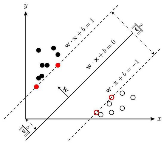 The SVM is a binary classification model. Its basic model is the linear classifier with the largest interval defined in the feature space. The basic principle of the SVM algorithm is to solve the separation hyperplane that can correctly divide the training dataset and has the largest geometric interval, as shown in Figure 4.