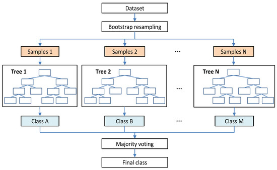 The RF model is a nonlinear classifier that uses multiple trees to perform integrated learning training on samples to complete prediction. It establishes a cluster classification model composed of many decision trees in a random manner, as shown in Figure 5.