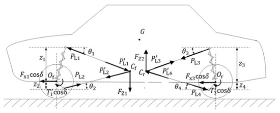 Taking the vehicle turning left as an example, the transmission process of the additional vertical force in the longitudinal plane and the lateral plane of the vehicle is analyzed separately. The following assumptions are made:
