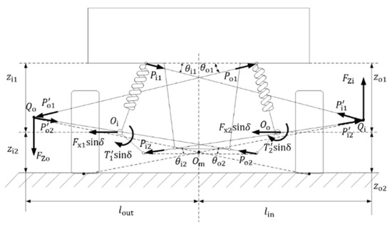 where Po1′ and Po2′ represent the force exerted by the front-outer suspension on the vehicle body, lout is the distance from the roll center to the instantaneous center of roll motion on the outside of the front suspension, θo1 and θo2 are the corresponding angle.