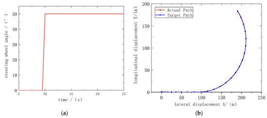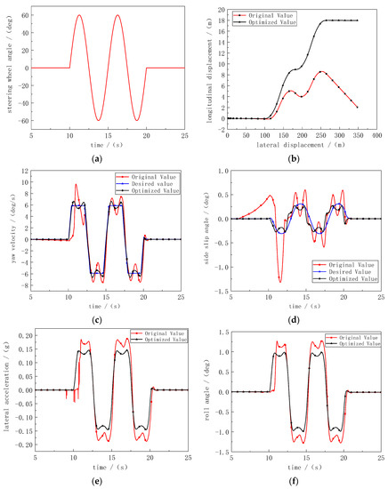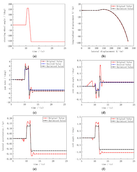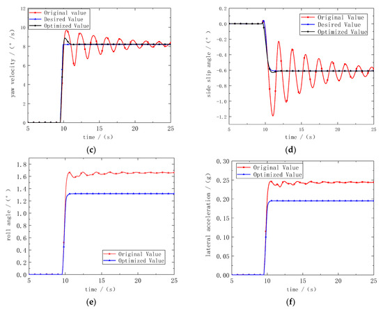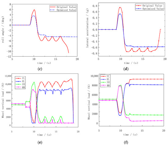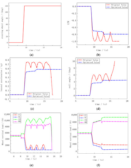Figure 9b shows that the LTR value fluctuates greatly without control. With control the LTR decreases by about 20%, and the curve changes smoothly and stabilizes at 0.8 s. It can be seen from Figure 9c the peak value of lateral acceleration drops from 0.8 g to 0.5 g with control, and the vehicle no longer rolls over. The lateral acceleration finally stabilizes at 0.55 g. Figure 9d shows the curve of the roll angle of the vehicle. The roll angle continues to increase until the vehicle rolls over without control. The peak value of the roll angle decreases significantly with control. The roll angle at the 20 s still stable at 4.5°. It indicates that the vehicle did not roll over at this time. Figure 9e,f show the changes of the vertical load of the four wheels before and after the control. The vertical load no longer fluctuates greatly with control Moreover, after the vehicle enters a right turn, the peak value of the inner wheel increases, and there is no 0 value. The vertical load of the outer wheel also decreases from 11,000 N at the maximum peak to 9000 N. The vehicle can maintain stable driving without rollover phenomenon.