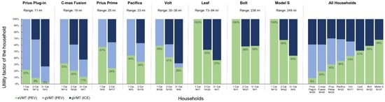 Utility factor (UF) of a PHEV—defined as the share of electrified vehicle miles traveled (eVMT) within total vehicle miles traveled (VMT)—is the most common metric in analyzing the performance of PHEVs in order to understand the degree to which they provide emission-free travel. Previous literature on the utility factor focuses either solely on the PEV or ignores the other conventional vehicles in the household. The literature on multi-car households with PEVs is also limited due to the difficulty of collecting (and, therefore, lack of) empirical data on multi-car households. See [10,11,12,13,14,15,16]. To our knowledge, there has not been any assessment of the UF at the household level—as the share of eVMT within total household miles traveled—that takes into account all vehicles in a household and captures the overall household electrification of miles. The goal of this paper is to fill this gap and assess the UF within the household context, and investigate how household factors impact electrification of vehicle miles traveled and fuel consumption, using an empirical data set. We used data from 650 vehicles which had onboard loggers that recorded driving and charging data for a year, distributed among 287 households where each household had a PEV. Our dataset included BEVs along with PHEVs, and the UF of the BEVs is one by default since all of their traveled miles are electrified. On the household level, UF can be calculated for BEV-households—since each household owns only one PEV, they can be classified as either a BEV or PHEV household—and this enabled us uniquely to compare the UFs of BEV-households and PHEV-households.