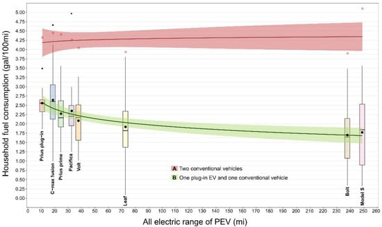 Figure 3 also shows a logistic regression curve (marked as A in the figure) for the household fuel consumption if the households had two of the same ICEV instead of one PEV and one ICEV. (We assumed a hypothetical scenario that the second ICEV would be the same as the one already owned, where in reality it could have a higher or lower MPG.) The difference between curve A and B visualizes how much fuel consumption is hypothetically saved through owning a PEV instead of an ICEV. We do not expect the difference in fuel consumption between households with a PHEV or a BEV to change much in the future because long range PHEVs such as Volt can have a higher fuel economy than a new ICEV. Volt production has ended, but similar long range PHEVs could have the potential to further lower household fuel consumption. The new EPA target of 1.9 ga/100 mi (166 gCO2/mi) [39] for 2023 and EU target of 1.75 ga/100 mi (153 gCO2/mi) [40] during 2020-24 for newly sold passenger cars, means that buying two new conventional passenger cars would end up consuming the same amount of fuel by the household as having a long range BEV and an older conventional car with lower MPG. To really achieve a decrease in fuel consumption, households will need to shift to two PEVs and no ICEV.