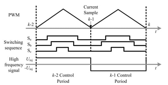 Figure 3 shows the injected high-frequency square wave signal and carrier wave with the traditional method. From Figure 3, to the traditional high-frequency square wave signal injection sensorless control method, the injected square wave signal frequency is 1/2 of the carrier wave. To complete the demodulation process of the primary high-frequency current (i.e., to complete the primary position estimation), it is necessary to sample the current value at three points, that is, the current value at the beginning of each PWM cycle. As shown in Figure 3, k-2, k-1, and k are three sampling points. So, it requires at least three PWM control cycles to complete one position estimation.