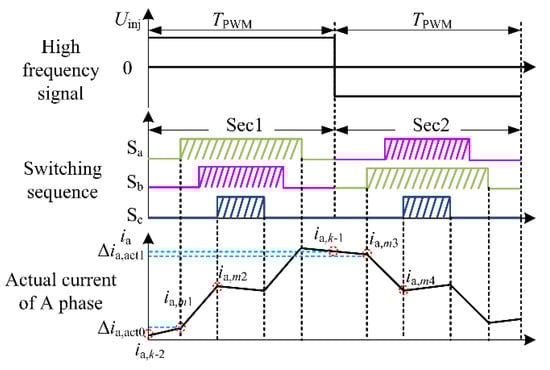 Because the high-frequency square wave signal is not injected into the inverter at the initial time of zero-vector action, there is no high-frequency response current in the zero-vector phase. To the traditional high-frequency square wave signal injection method, the current sampling point is usually selected at the zero-time of the PWM cycle for the convenience of sampling and calculation. In Figure 9, ia,k-2, ia,k-1, and ia,k cause the current change to produce errors. Section 2.2 has analyzed the reasons of the errors.