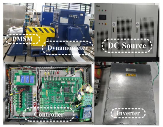 To verify the effectiveness of the proposed method in this paper, the PMSM experimental platform as shown in Figure 12 is set up. The experimental platform consists of the dynamometer, DC power supply, inverter, control circuit, and PMSM. The dynamometer is an asynchronous motor driven by the ABB ACS-800 AC drive. The digital signal processing chip of the control circuit is TMS320F28335, and the inverter adopts the electric vehicle GD12-WDI power unit produced by Semikron. The motor parameters are shown in Table 2. The amplitude of the high-frequency square wave voltage injected into the de axis is 40 V and the frequency is 2.5 kHz. The switching frequency of the experimental system is 5 kHz.