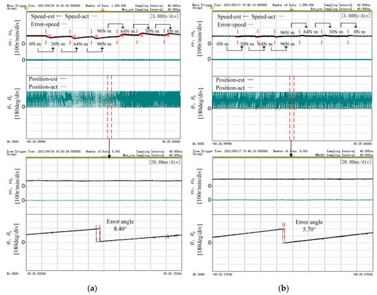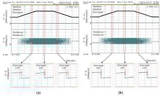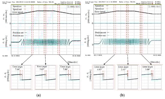 From the local enlarged view in Figure 13a, it can be clearly calculated that with the traditional method that the angle error is 5.70° during acceleration, the angle error is 2.85° when the speed of the dynamometer was controlled at 400 r/min, and the angle error is 5.54° during deceleration. From the local enlarged view in Figure 13b, it can be clearly calculated that with the proposed method in the paper, the angle error is 2.65° during acceleration, 1.20° when the speed of the dynamometer was controlled at 400 r/min and 2.44° during deceleration.