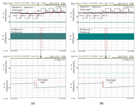 From the local enlarged view in Figure 15a, it can be clearly calculated that with the traditional method, the angle error is 4.80° when the applied torque by dynamometer motor changed from the rated load of 64 Nm to the 1.5 times rated load of 96 Nm. From the local enlarged view in Figure 15b, it can be clearly calculated that with the proposed method, the angle error is 2.22° when the applied torque by dynamometer motor changed from the rated load of 64 Nm to the 1.5 times rated load of 96 Nm. Compared with the traditional method, the position angle error of the proposed method is smaller. As can be seen from the tested motor speed waveform in Figure 15a, when the applied torque by dynamometer motor changed abruptly, the speed of the traditional method changes greatly and recovers slowly. As can be seen from Figure 15b, when the torque applied by the dynamometer motor changed abruptly, the speed change of the proposed method was small, and it recovered quickly.