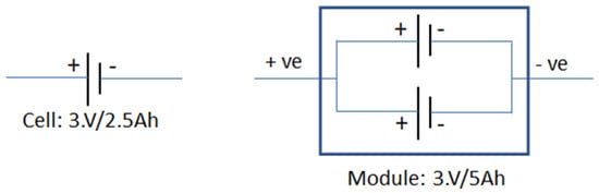 The number of modules and the batteries that are connected depend on the architecture of the battery pack and the maximum voltage that is required. In this design, we consider 16 cells to form a battery pack. Figure 1 represents a single module in which two cells are connected in parallel. Figure 2 depicts eight modules connected in series, with each module consisting of two cells in parallel. Across each module, an optocoupler is connected. The output of the optocoupler is given to the ESP32 microcontroller. An NTC (thermal sensor), a WCS1800, a display unit, two transistors, and two MOSFETs are connected to the microcontroller. The battery that is used in the design is a li-ion NMC (lithium-ion nickel manganese cobalt) battery with 3.7 V and 2500 mAh. Figure 3 helps us understand the measurement of voltage, current and temperature of a battery pack connected with the microcontroller using linear optocoupler.