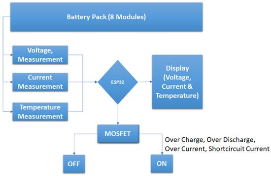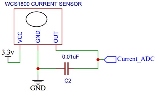 A sensor, WCS1800, is incorporated into the system to measure the current of the total pack. The terminal of the sensor is connected to the microcontroller. The measured current is measured by the MOSFET that is connected to the output terminal of the microcontroller, and accordingly, the MOSFET turns off during the conditions of overcurrent and short-circuit current. The current measurement circuit is shown in Figure 5. The ADC value is calculated by (4)