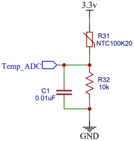 An NTC glass thermistor is connected to pin 13 of the microcontroller to measure the temperature of the total pack. The temperature measurement circuit is shown in Figure 6. When supply voltage is given to the temperature measurement circuit, if the temperature is 0, resistance R31 is high. The value of resistance R31 varies depending upon the variation in temperature. If the resistance R31 decreases, then the voltage flow in the circuit increases, which results in an increase in the temperature. The temperature that is being varied is sensed accordingly.
