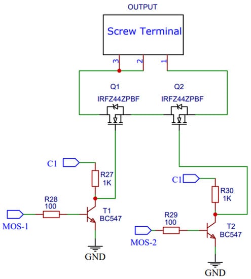 An IRFZ44 MOSFET is used, which acts as a switch. The MOSFET operates under the conditions of high current, high voltage, undercurrent, and undervoltage. The overcharge and overdischarge control circuit is shown in Figure 7. Two MOSTETs, T1 and T2, are connected in series along with transistors Q1 and Q2 to the terminals of the microcontroller. A transistor is connected across each MOSFET to turn on and off the MOSFET under the conditions of overdischarge and underdischarge. During the conditions of overdischarge and underdischarge, the circuit acts as an open circuit.