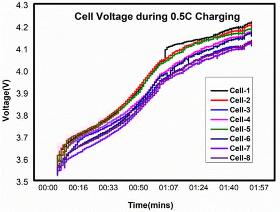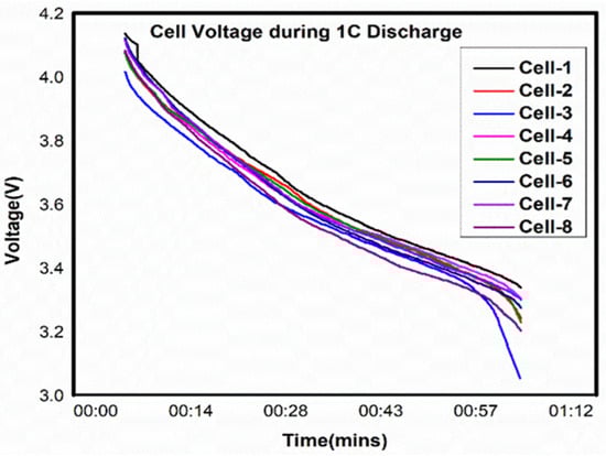 The respective values of each cell and the total pack are mentioned in the table with respect to the graph in Figure 13. The charge and discharge plots are projected in Figure 12 and Figure 13, respectively. The above Figure 13 helps us understand the charge curve of individual cells in a battery module. Here, the plot shows the voltage and charging time, when each cell has been charged and reached its full charge voltage at a coulomb rate of 0.5 C, with a charging time of 2 h. The above Figure 12, helps us understand the discharge curve of individual cells in a battery pack with parameters such as voltage and discharging time when each cell has discharged and reached its full discharge voltage at a coulomb rate of 1 C in one hour.
