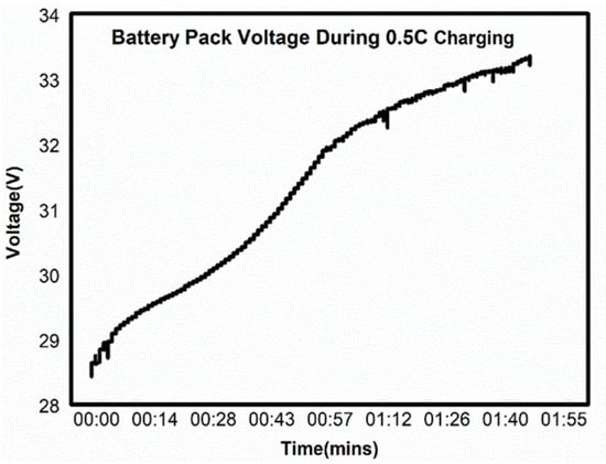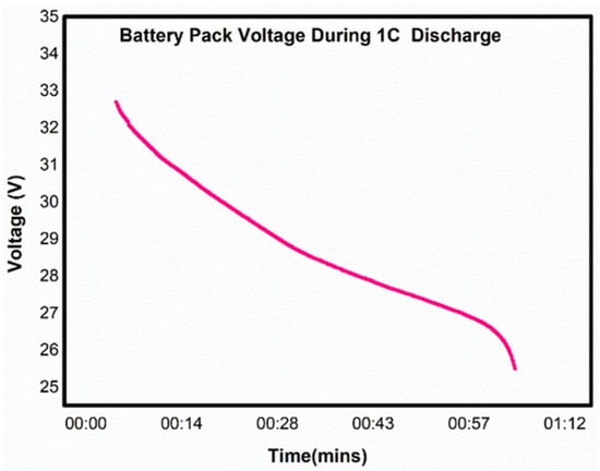 The battery is charged with 0.5 C with starting and cutoff voltages range from 28.39 V to 33.4 V. The charging and discharging curves that are obtained are represented in the below Figure 14 and Figure 15, respectively. During discharge, the starting and cutoff voltages ranges from 32.61 V to 25.22 V.