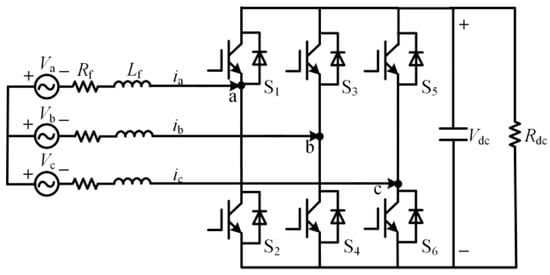 In the Figure 2, Va, Vb and Vc are three-phase symmetric AC voltages, ia, ib and ic are corresponding three-phase AC currents, S1–S6 are six way switches, Vdc is the DC side voltage of the rectifier, Lf is the filter inductor, Rf is the sum of the resistance in the filter inductor and the equivalent resistance of the switch loss, and Rdc is the load resistance.